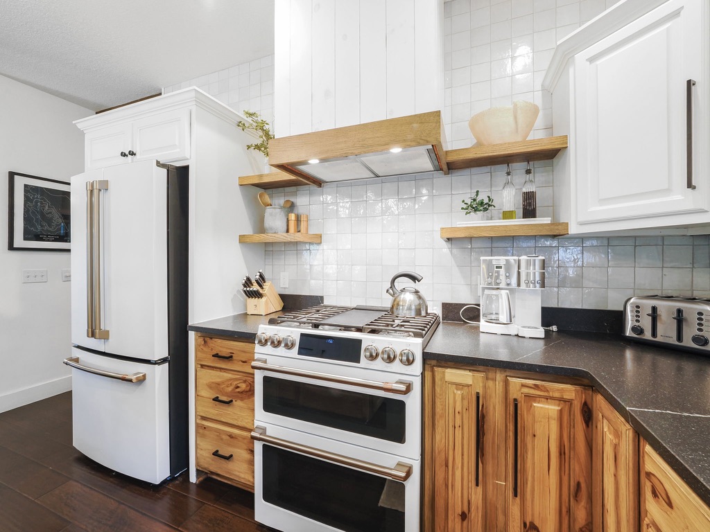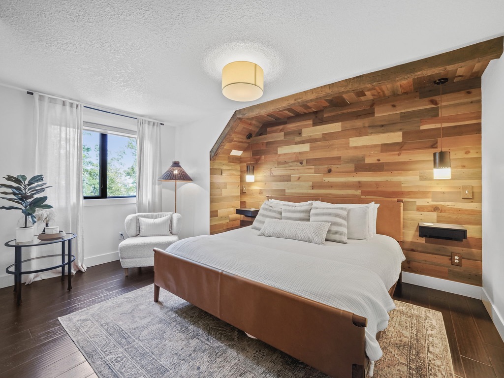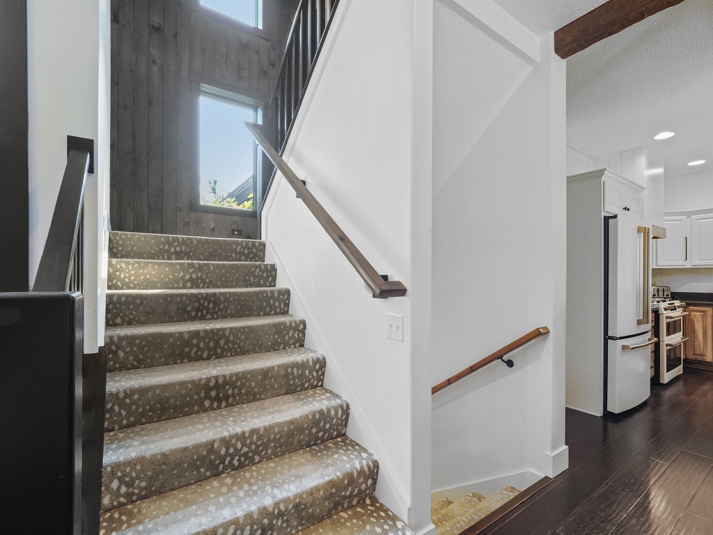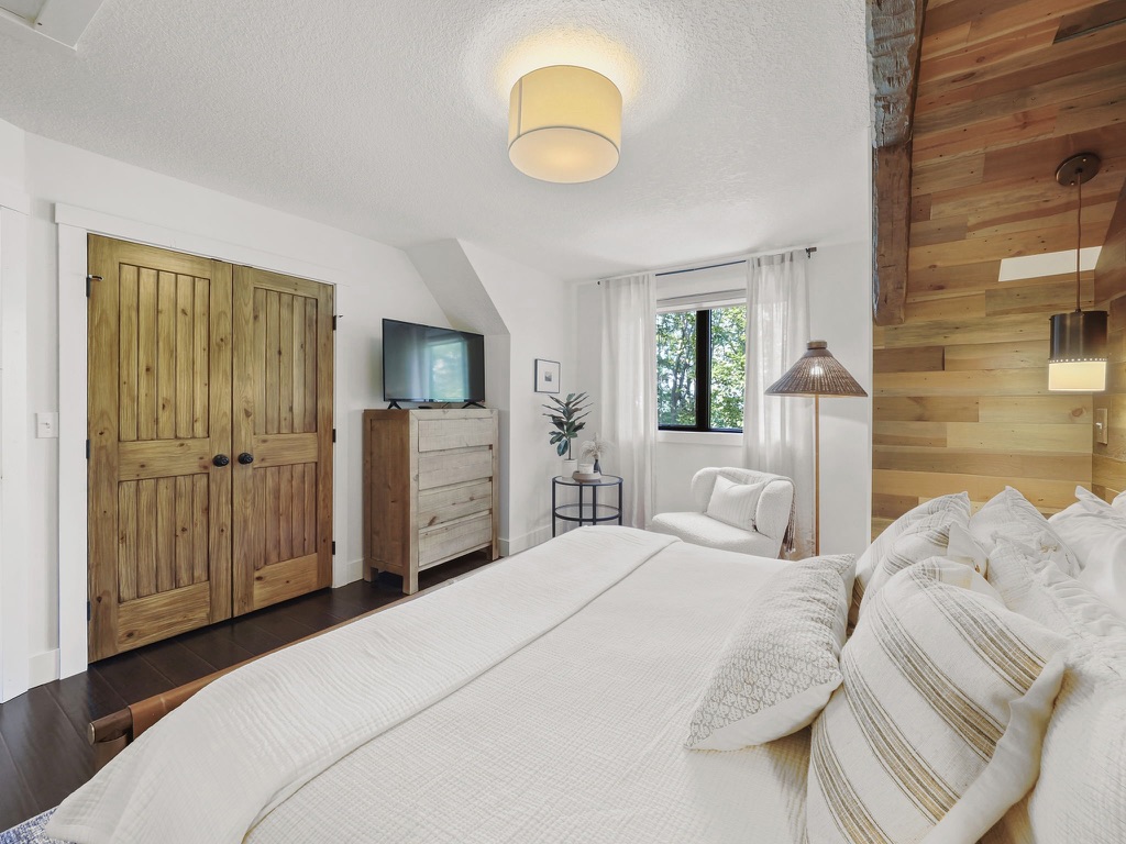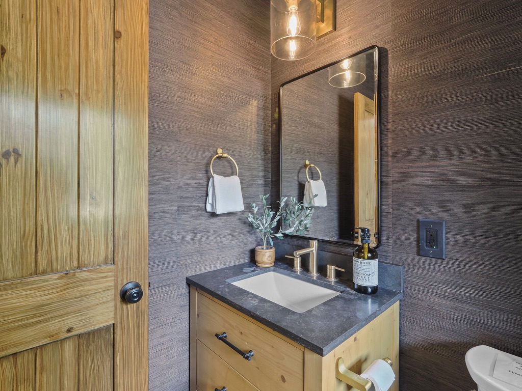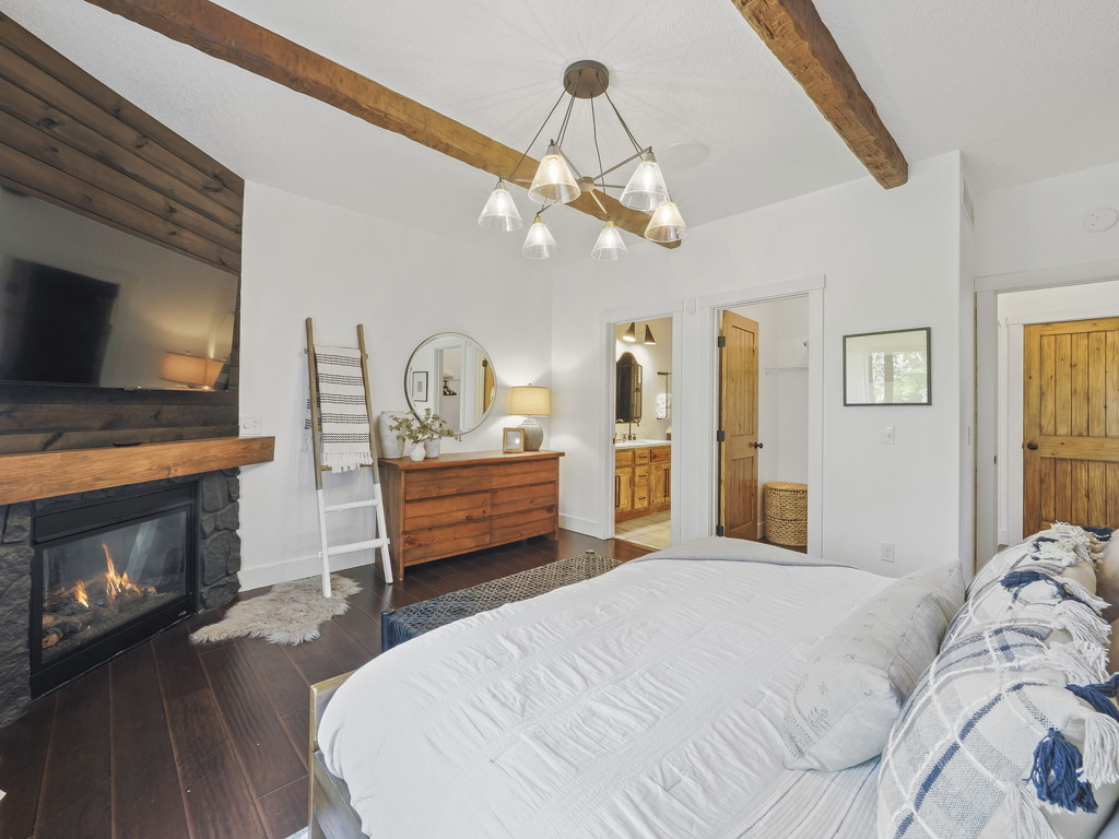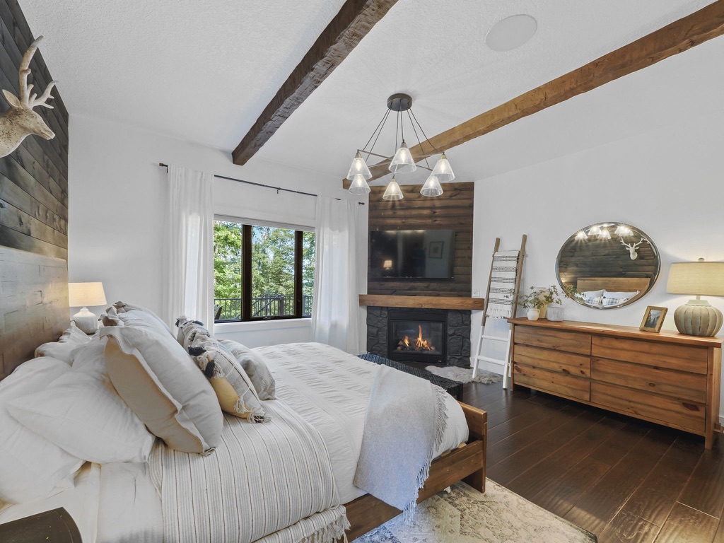 The main level living area has abundant seating, a vaulted ceiling, gas fireplace, and a flat screen TV. For added convenience, there is a powder room located off the main living area. The master bedroom hosts a king bed, en suite bathroom with double sinks and granite countertops. And for added luxury and touch, enjoy your private gas fireplace and flat screen TV, in this beautiful master bedroom!