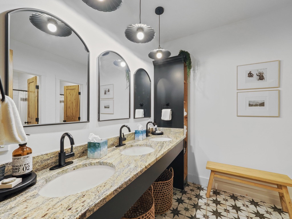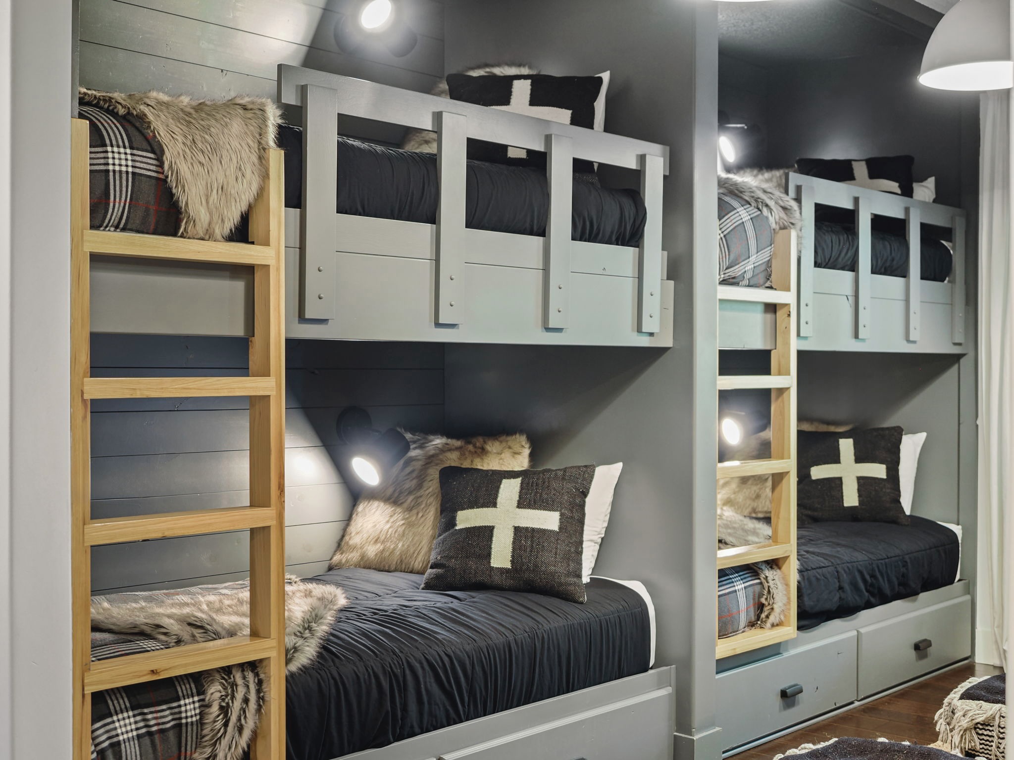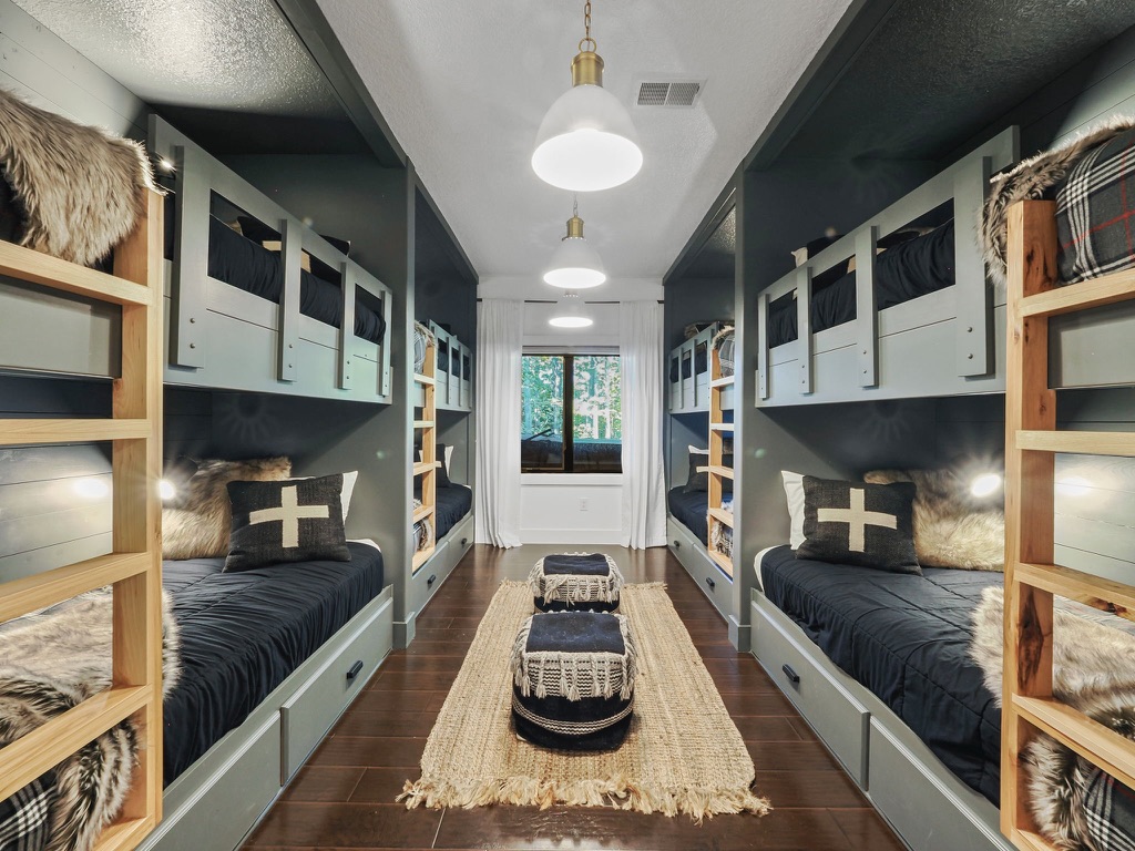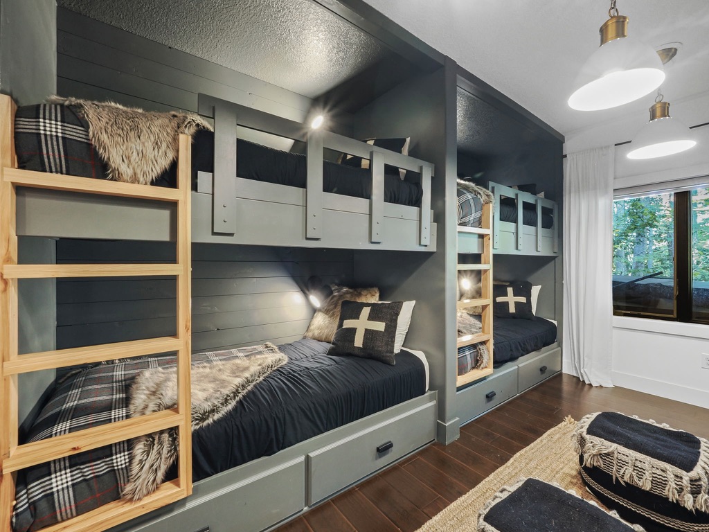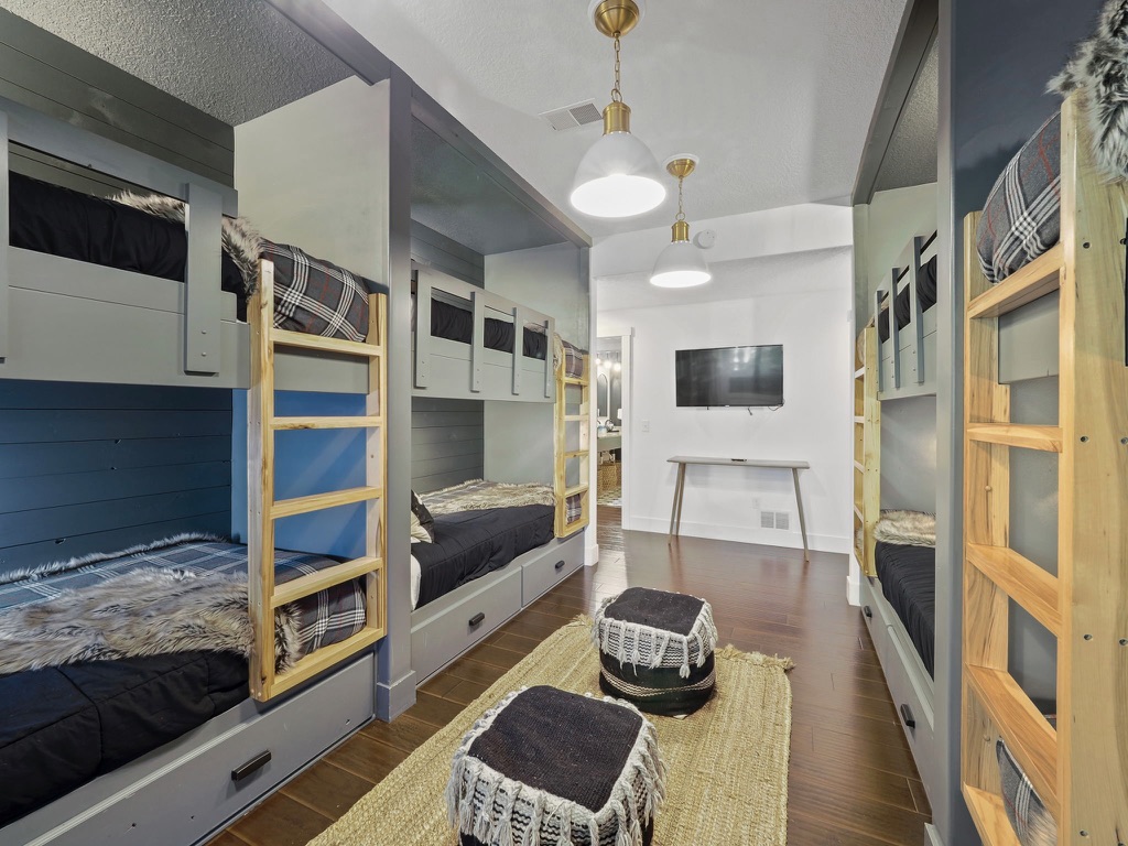 Located on the lower level, "The Bunk Room" features eight custom built bunk beds that can sleep young children and young adults! The lower bathroom has triple sinks and an incredibly ingenious shower set up with 2 single stalled showers so more people can get ready at once.